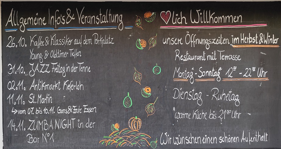 Wir wünschen Ihnen einen angenehmen Aufenthalt bei uns in unserem Restaurant mit Terrasse und unterm Blätterdach des Kastaniengartens.